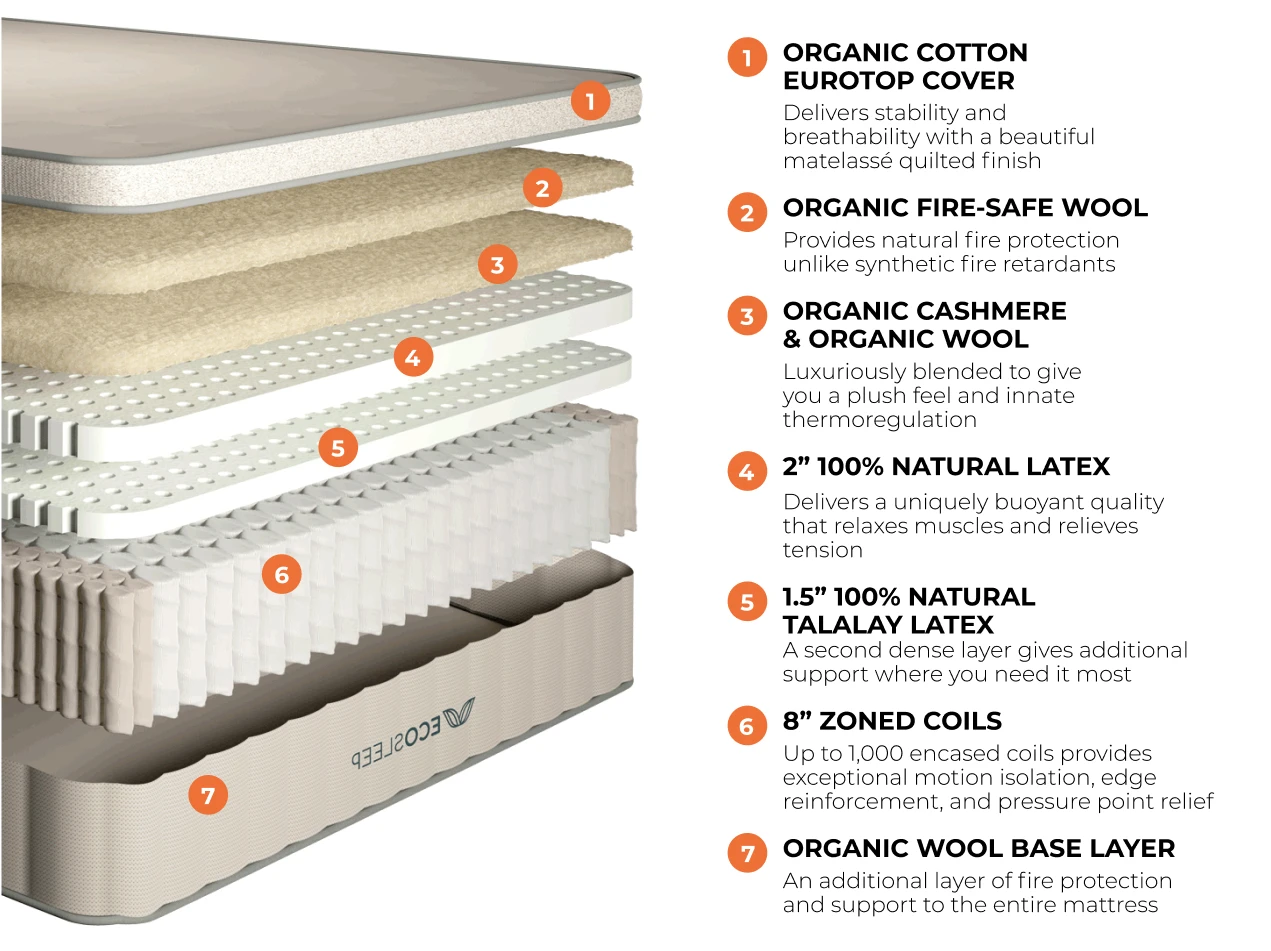 The EcoSleep Lux mattress from Brooklyn Bedding is a hybrid comfort/euro top US-made natural mattress with eco-minded design features. It has an 8-inch coil core for maximum support and sturdiness, enhanced with natural Talay latex organic wool and cashmere for comfort and pressure relief. These materials contribute to a pillow-top feel, airflow, and temperature regulation so no one gets hot while sleeping. The EcoSleep Lux mattress is also bedded in organic cotton to make all the sleeping moments relaxed and cozy. The EcoSleep Lux mattress comes in a firmness that offers a rounded feel that is suitable for side and stomach sleepers and back sleepers.